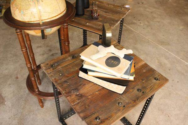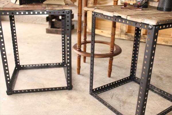 It would be uncomfortable to sit on the living room sofas and couches without a side table support. Nowadays these side tables are trend and make any couch or sofa look perfect and sophisticated. To get it cheaply you may use the pallet wood as perfect furniture solution. We reclaimed some pallets and some industrial metal scrap from home store room to get these DIY pallet industrial end tables with lasting sturdiness. Metal scrap has been welded to gain a squared shaped design then we just topped it with pallet wood.